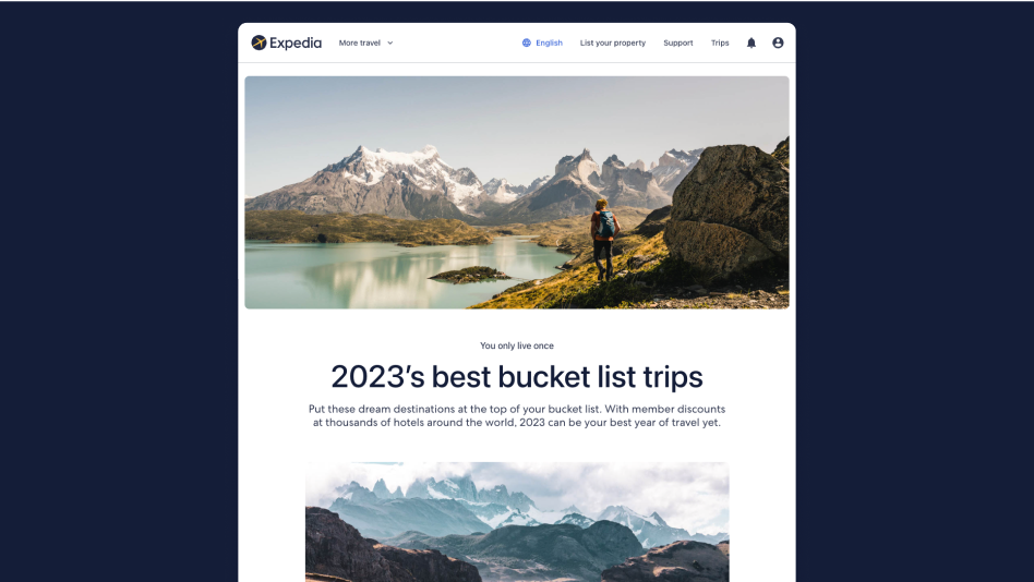 Home pagesA home page is the first page for any site and is typically where most travellers start their journey. Each Expedia Group home page, such as Expedia.com, is designed with searches in mind. All branded home pages have been expertly crafted to allow any visitor to search for a travel product with ease and convenience, be it a hotel, flight or more. Our most popular home pages are Expedia.com, Hotels.com and Vrbo.com. Use-Case Example – This Black Friday, all Expedia properties are available at 10% off! Take a look today at Expedia.com.