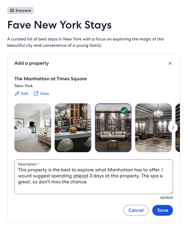 Collections are an easy way to share your favorite hotel recommendations in a list format with your audience and other travelers. These Collections are displayed on your Travel Shop and can be shared directly via a unique link.